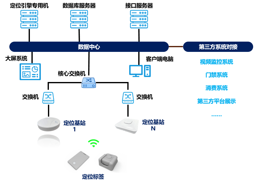 如图所示:前端定位基站与定位标签进行实时定位数据采集,通信方式为无线通信,定位数据通过传输网络传回到中心机房的定位引擎专用机,通过定位引擎将前端采集的数据信息进行精准解算,并通过平台软件进行具体位置呈现。