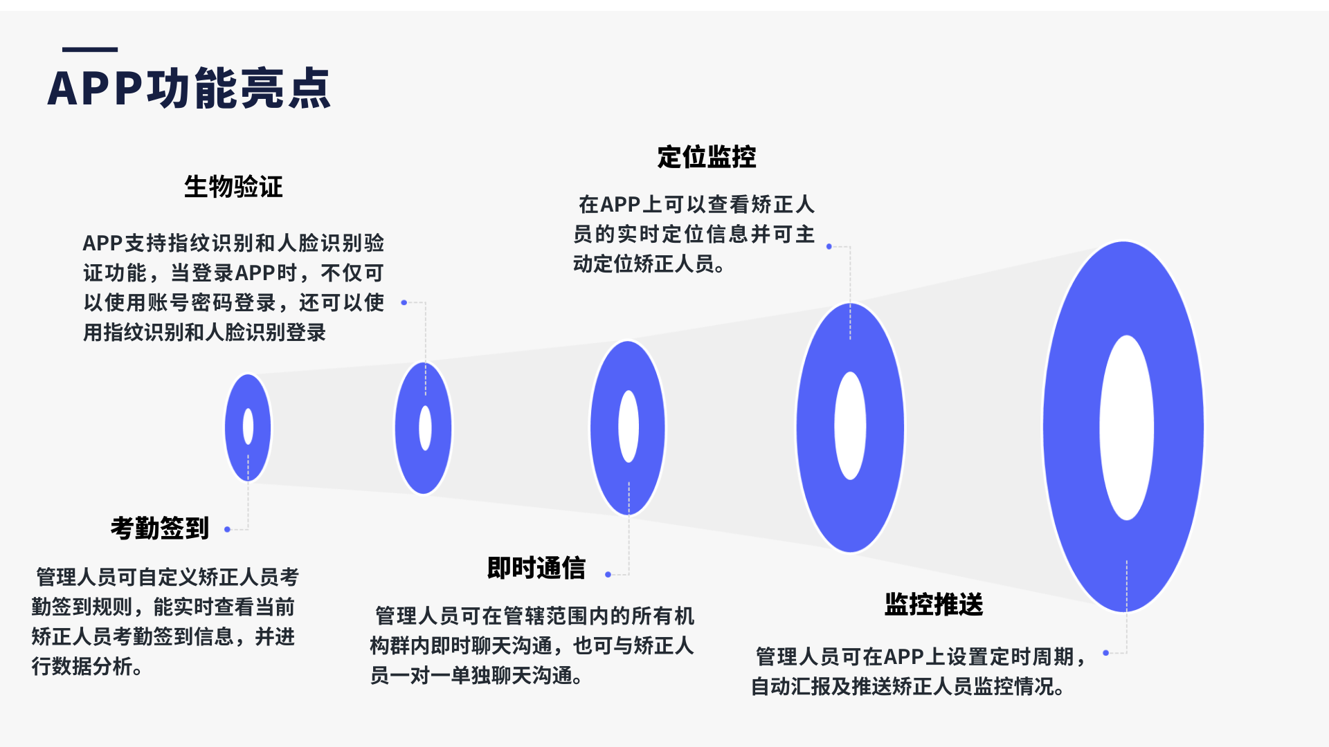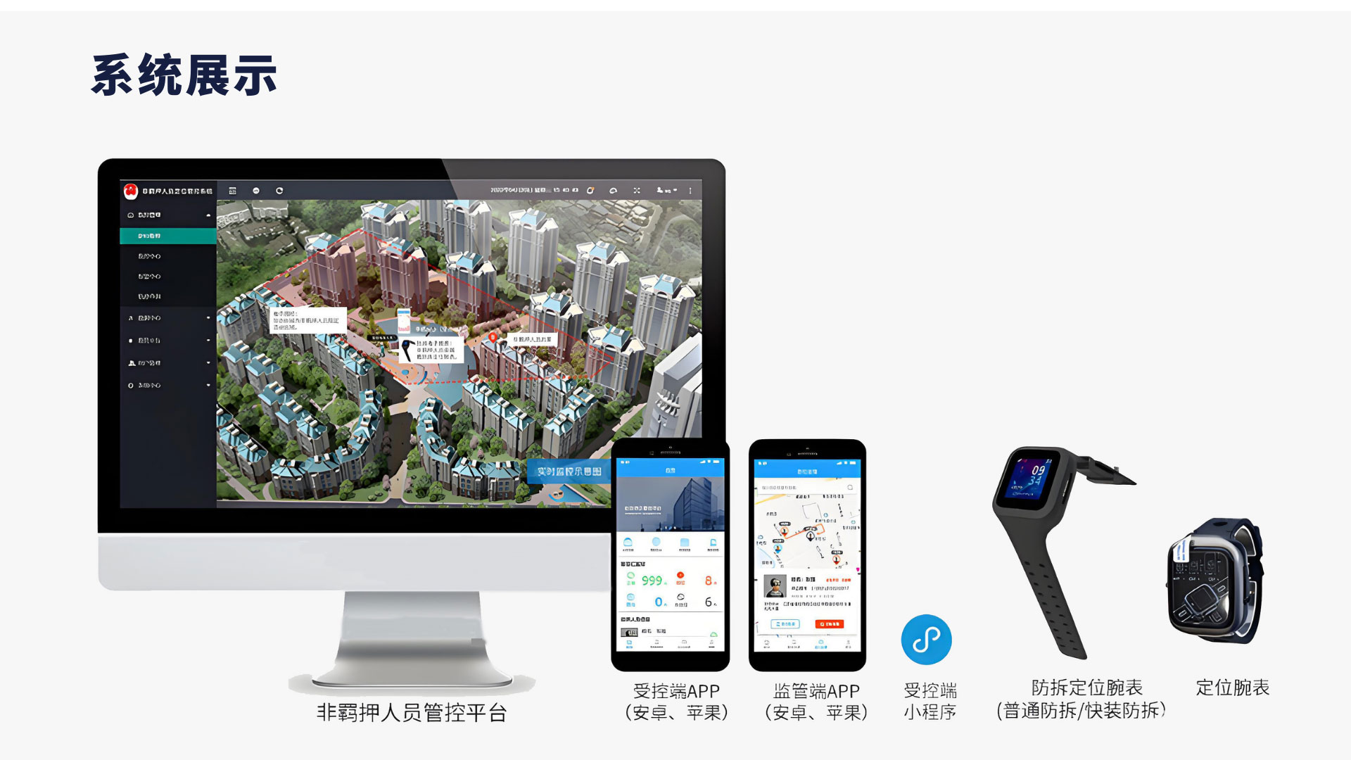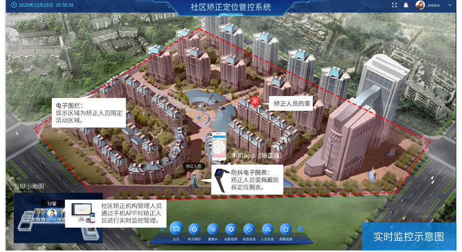 电子手环(非羁押/社区矫正/离监探亲)人员定位管控解决方案,系统以电子手环为基础,应用于非羁押、社区矫正、离监探亲等场景对看管人员的位置、行动轨迹、活动区域等进行有效及时的监控,结合司法系统的实际日常工作,业务逻辑,对信息进行整合和处理,达到使用简便,效果直观,管理有效,功能强大的目的。为提升司法针对特定人群的监管水平,使其监管工作向合理化、人性化 、智能化、效率化方向发展。
