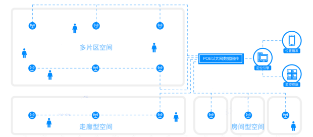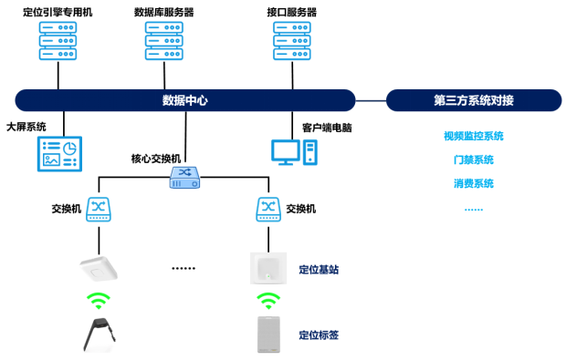 如图所示:前端定位基站与定位标签进行实时定位数据采集,通信方式为无线通信,定位数据通过传输网络传回到数据中心的定位引擎专用机,通过定位引擎将前端采集的数据信息进行精准解算,并通过平台软件进行具体位置呈现;