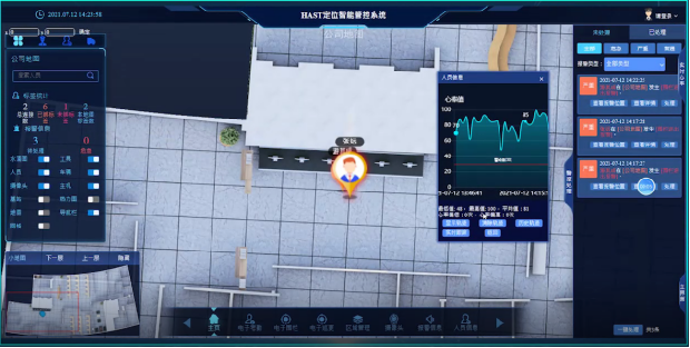 腕表上集成生命体征监测模块,可对佩戴腕表的人员进行心率监测,可以通过设定一个范围,如果超过或低于这个范围就会自动报警至后台。