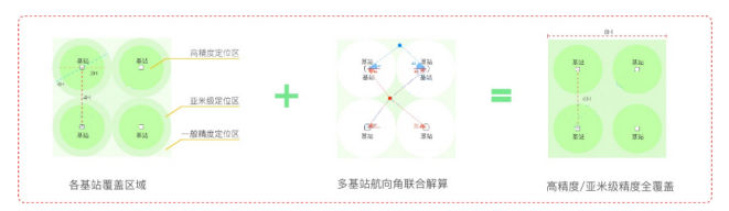 在单基站二维定位的基础上,进行各定位基站的大规模组网,多基站航向角联合解算,实现更大范围的高精度定位的全覆盖。