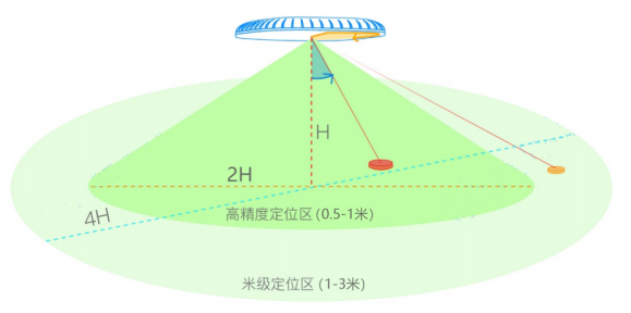 如果被定位终端的高度变化较小,可以采用固定高度的单基站二维定位方法,如下图所示。通过AOA角度估计可以获得从基站出发的一根射线,该射线和定位终端的高度平面相交便可获得平面坐标。从图中可以看出,单基站的定位覆盖是以基站为中心的锥形区域,距离基站越远,相同角度误差带来的平面坐标的变化越大,位置误差越大,越靠近基站定位精度越好。可以通过适当提高终端到基站的高度差H,来提高高精度定位区域的覆盖范围。