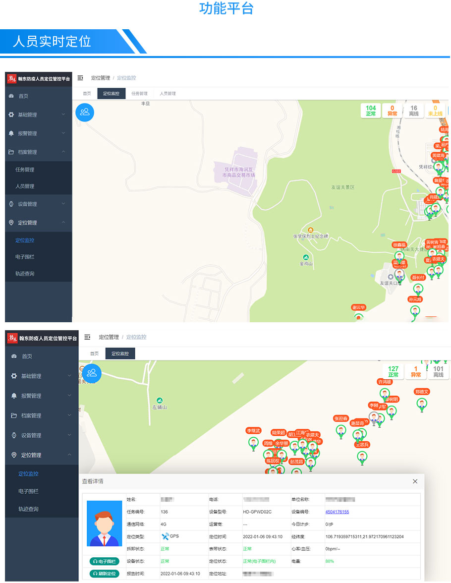 通过手机端APP,也可能实现对人员的位置、状态、轨迹、通信进行管理。大大减少管理难度。