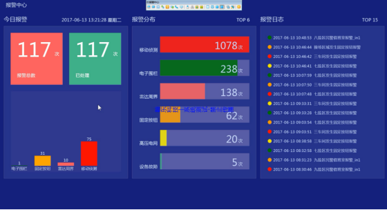 报警信息分类展示:按照报警分类进行图形化分类汇总展示,并根据实时要求显示最近X条报警信息,最近未处理的报警信息,点击报警信息可查看报警详情;