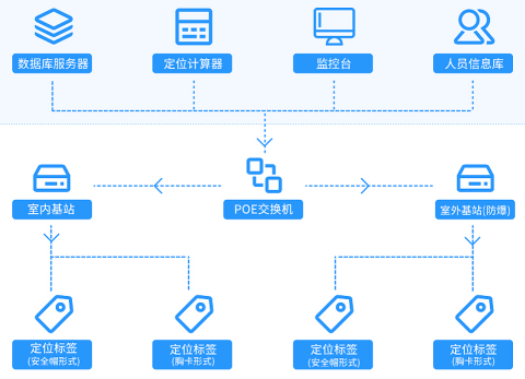 如图所示:前端防爆定位基站与定位标签进行实时定位数据采集,通信方式为无线通信,定位数据通过传输网络传回到中心机房的定位引擎专用机,通过定位引擎将前端采集的数据信息进行精准解算,并通过平台软件进行具体位置呈现。
