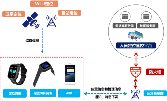 本系统以定位腕表(防拆+不防拆2种腕表)为核心、以运营商基站作为数据传输并且搭配LBS、Wi-Fi室内辅助定位的人员定位管控系统,配合、PC实现安全管理。