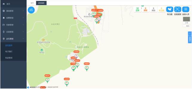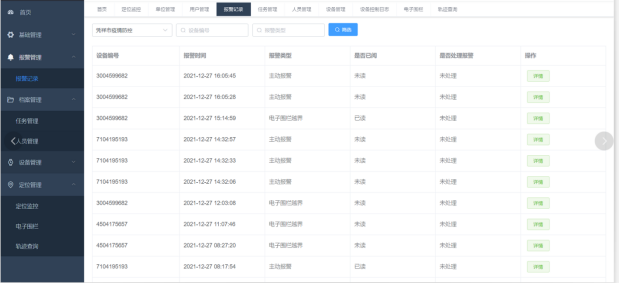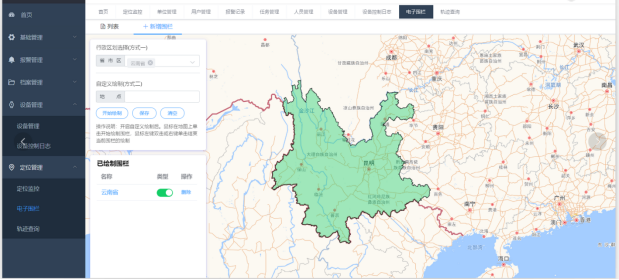 管理后台支持设置通过行政区域及自定义绘制方式设置可活动围栏及禁止进入电子围栏;支持设备电子围栏越界报警检测;支持电子围栏删除记录查询。