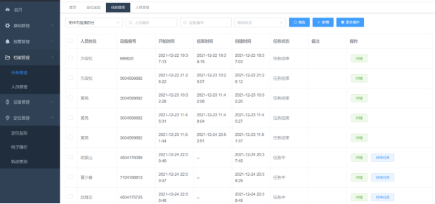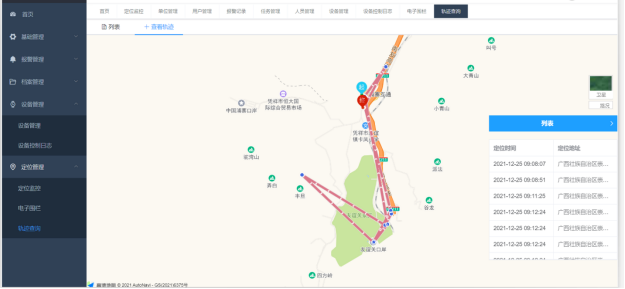 管理后台记录佩戴人员所有历史位置信息,管理人员通过分配的权限,使用PC能够详细的查询佩戴人员的历史运动轨迹以及所有定位点的详细状态信息,并对数据做出异常行为统计分析。并通过轨迹回放进行查看佩戴人员在此期间的活动轨迹。