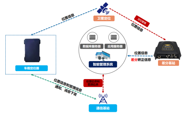 如图所示,车辆安装车载定位器。定位终端启用卫星定位或者卫星+差分基站矫正位置信息。定时更新定位信息,并将信息通过传输网络(运营商基站)传回云平台进行统一管理、分析、统计。管理机构可信息互通共享,实现统一查看车辆的状态信息,通过权限分配,实时查看定位信息以及报警信息等。