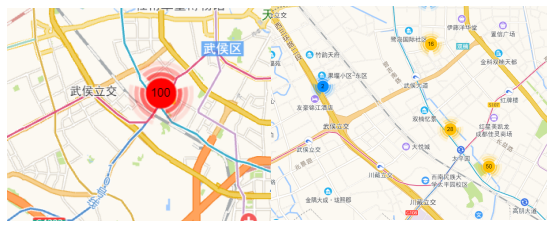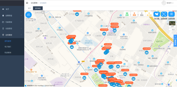 在小比例尺地图下,系统会以不同的颜色进行展示管理车辆,不同的颜色代表不同的密集程度,当地图比例尺放大到一定程度后,方显示管理车辆的具体位置。