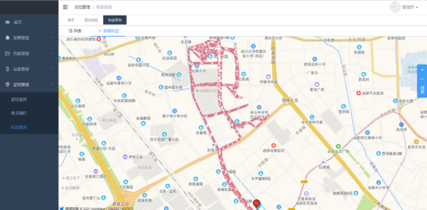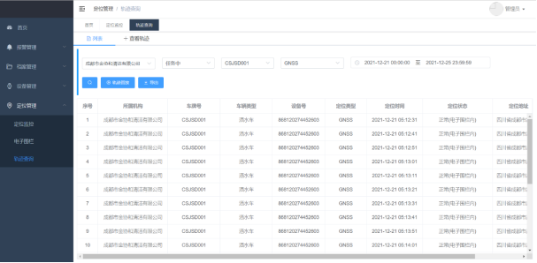 可根据需要查询车辆在某段时间内通行轨迹,为管理人员对事件的梳理和排查工作提供辅助作用。轨迹可以使用列表形式展示每个时间点上传的车辆位置,也可以在地图上生成车辆轨迹路线图。