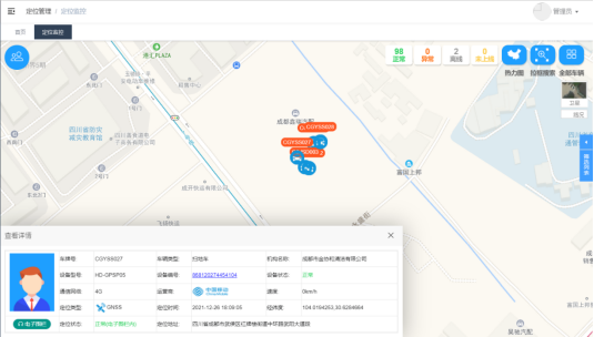 用户可在平台上选中指定车辆查看车辆当前的实时位置、定位状态、定位类型、通信网络、设备状态等信息。