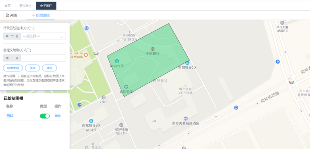 系统支持通过行政区划选择以及自定义绘制两种方式定义电子围栏范围,用户可根据需要灵活的设定单个或多个电子围栏。当未授权的车辆进入/离开特定区域,系统会收到相应的报警提示。