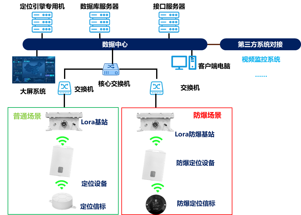 通过低功耗蓝牙信标向周围发送自己特有的ID,定位标签(定位胸卡)可以扫描并解析出ID,通过LORA基站传回中心平台进行统一管理、解析、分析、存储、统计,通过大屏系统对人员定位信息进行实时展示。