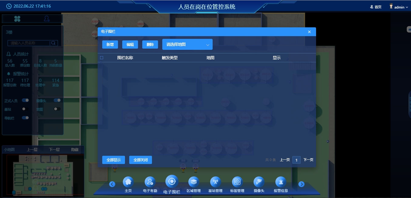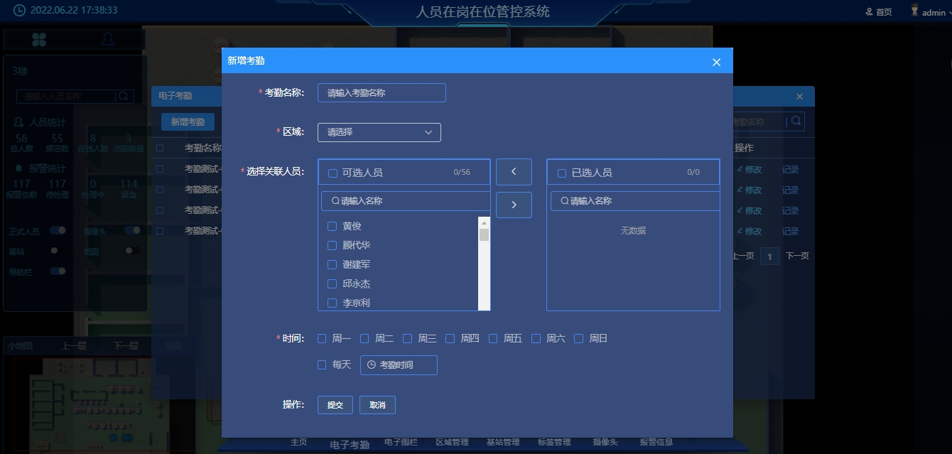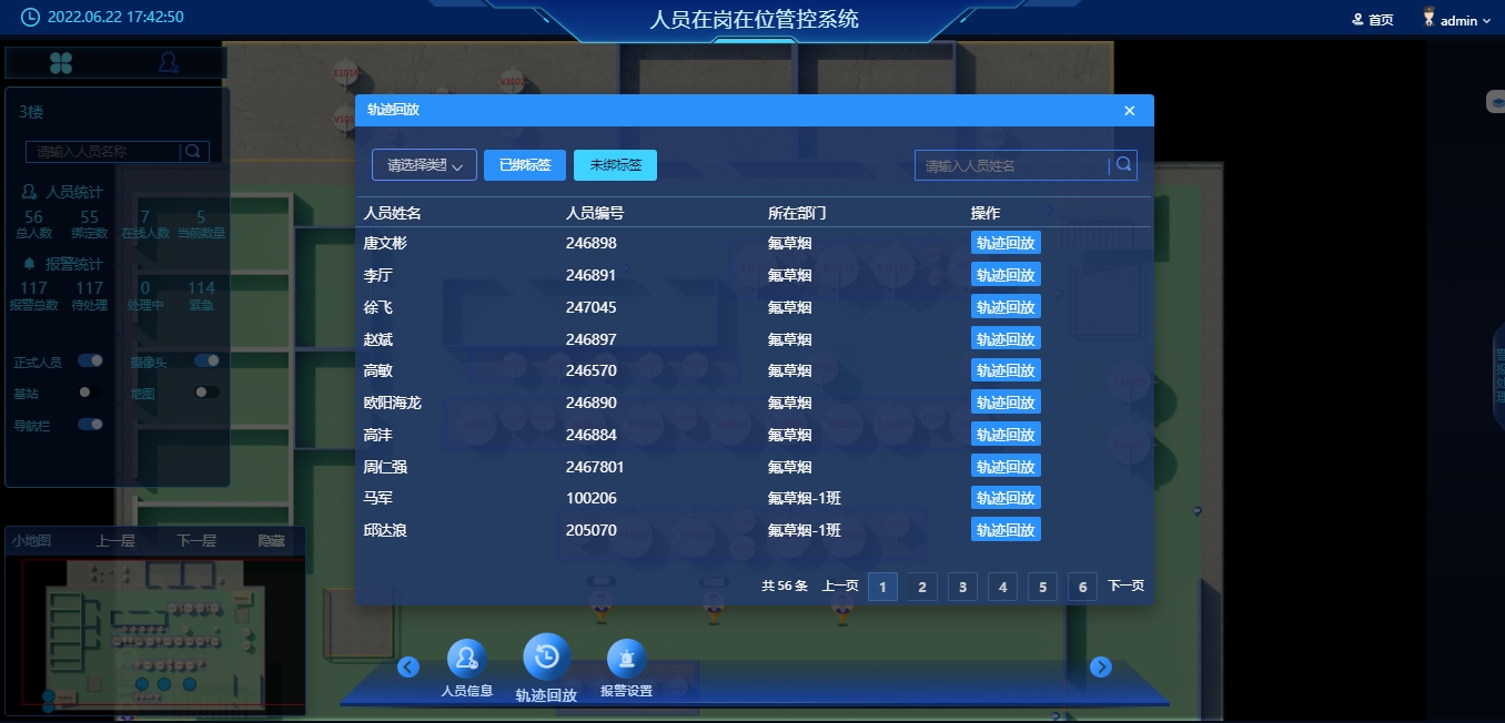 实时信息:可以实时显示电站作业人员信息列表,在地图界面上,鼠标悬停或点击即可显示指定人员详细信息,如姓名、工号、部门、电话号码、岗位及停留时长;同时实现人员查找功能即输入姓名可定位员工所在区域。