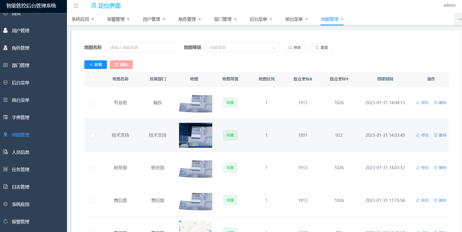 定位地图的新增、删除、修改功能;地图目前支持类型jpg、png;支持图片尺寸测量。