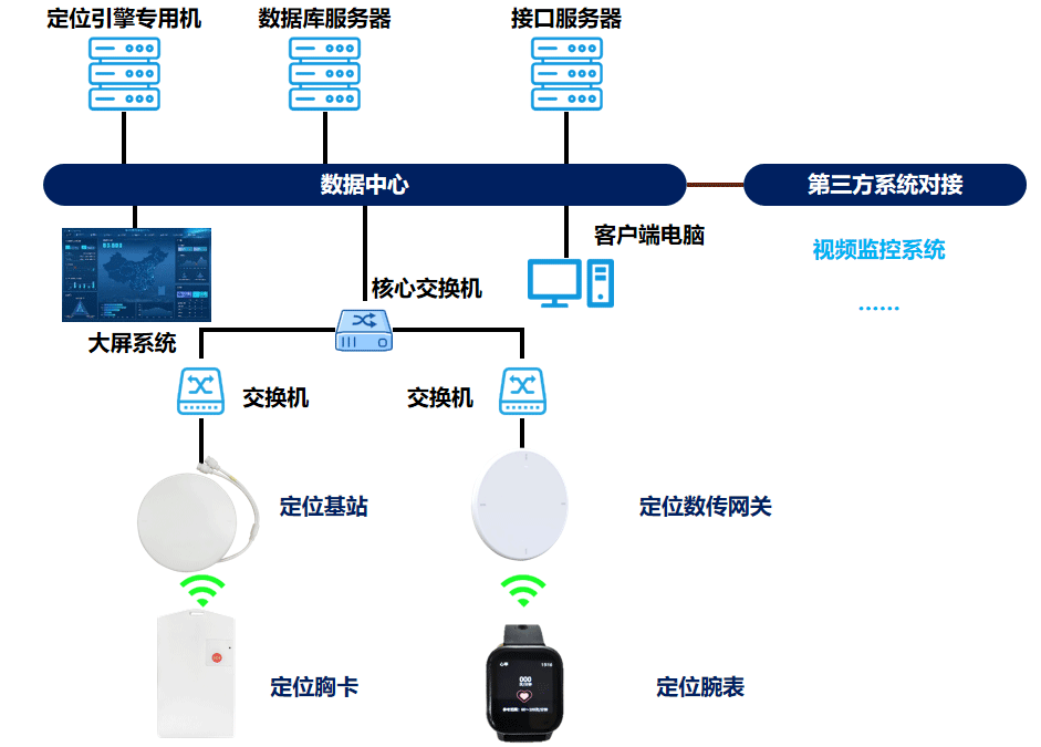 如图所示:前端定位基站与定位标签进行实时定位数据采集,通信方式为无线通信,定位数据通过传输网络传回到数据中心的定位引擎专用机,通过定位引擎将前端采集的数据信息进行精准解算,并通过平台软件进行具体位置呈现;另可只配置数传网关进行数据接收、下发(数据下行)。