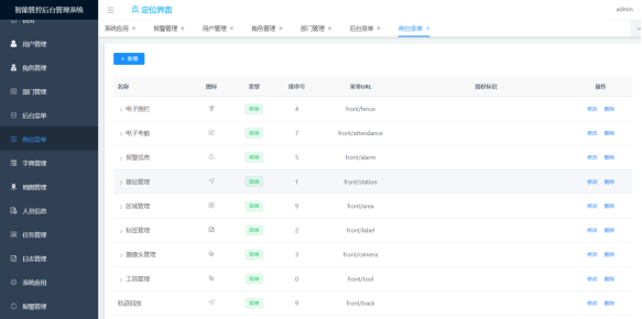 前台菜单的新增、删除、修改功能;菜单分类包括目录、菜单和按钮,支持权限精确到按钮级别;支持数据权限。