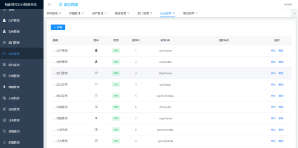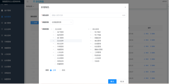 后台菜单的新增、删除、修改功能;菜单分类包括目录、菜单和按钮,支持权限精确到按钮级别;支持数据权限。