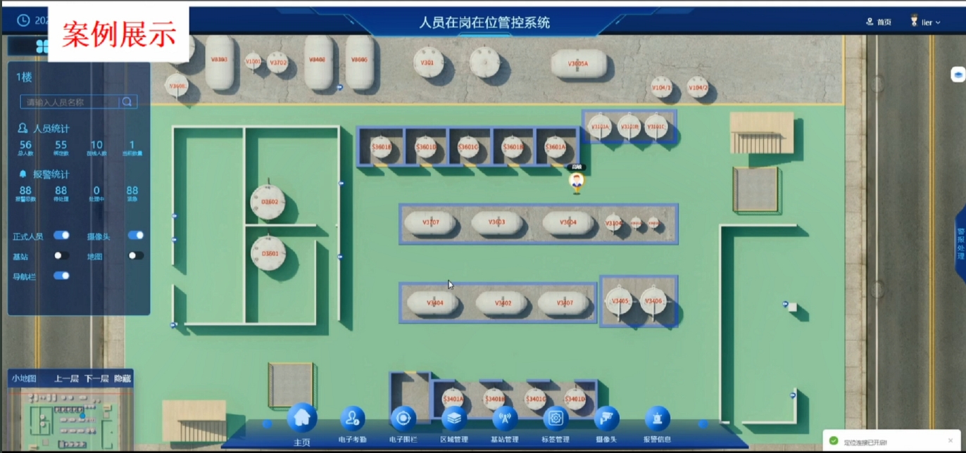 可实时记录人员的位置分布情况,可对员工进行不同工种分类管理,可有效对员工进行调遣安排、工作监督,提升生产效率;在发生危险时,可对即时了解工厂人员分布及疏散情况,可对滞留人员位置进行定位,从而进行快速救援。