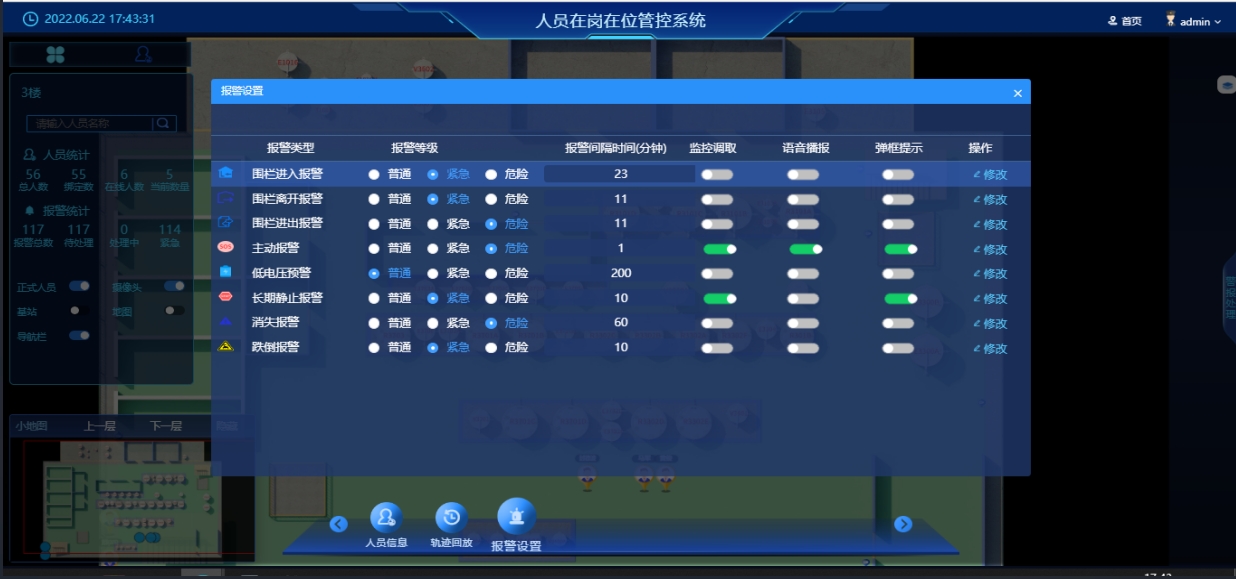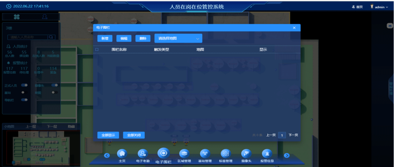 在展示平台地图上可以通过绘制任意形状的形成相应的电子围栏,并根据圈定的区域危险性、重要性,设置电子围栏属性等级,电子围栏可以设置不同的规则,包括但不限于闯入报警、离开告警等;不同的等级触发时候将发出不同的告警信息,对于重要的电子围栏区域,若有人触发时不仅会发出相应的报警,而且还会在定位监控界面联动视频,平台弹出相应的监控画面,方便管理人员直观的查看判断现场情况。