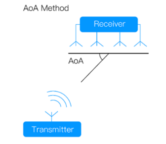到达角定位(AOA)是利用单一天线发射寻向讯号,而接收端的装置内建天线阵列,当信号通过时,会因阵列中接收到的不同距离,产生相位差异,进而计算出相对的信号方向,其技术原理如下所示: