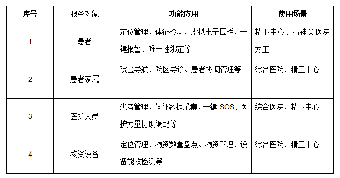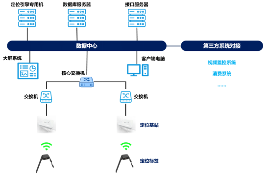 如图所示,前端设备分别有定位基站和定位腕表,在精神病院内部合理布设定位基站,对整栋大楼内和院区的精神病人实现定位信号全覆盖,并对覆盖范围内的精神病人进行精准定位;定位腕表由精神病人进行佩戴,定位基站与腕表标签进行无线数据通信,采集到的位置信息通过医院内网将数据传回平台进行分析、管理、统计。